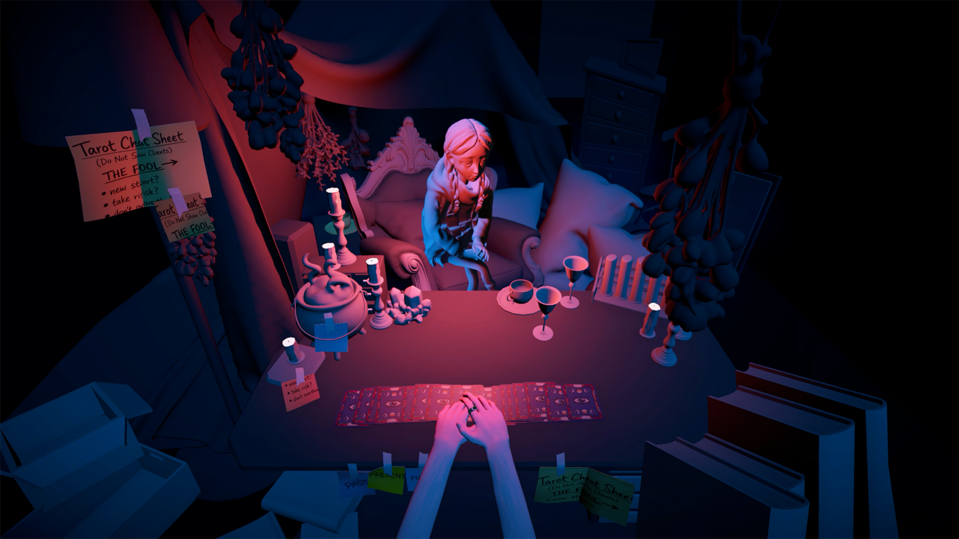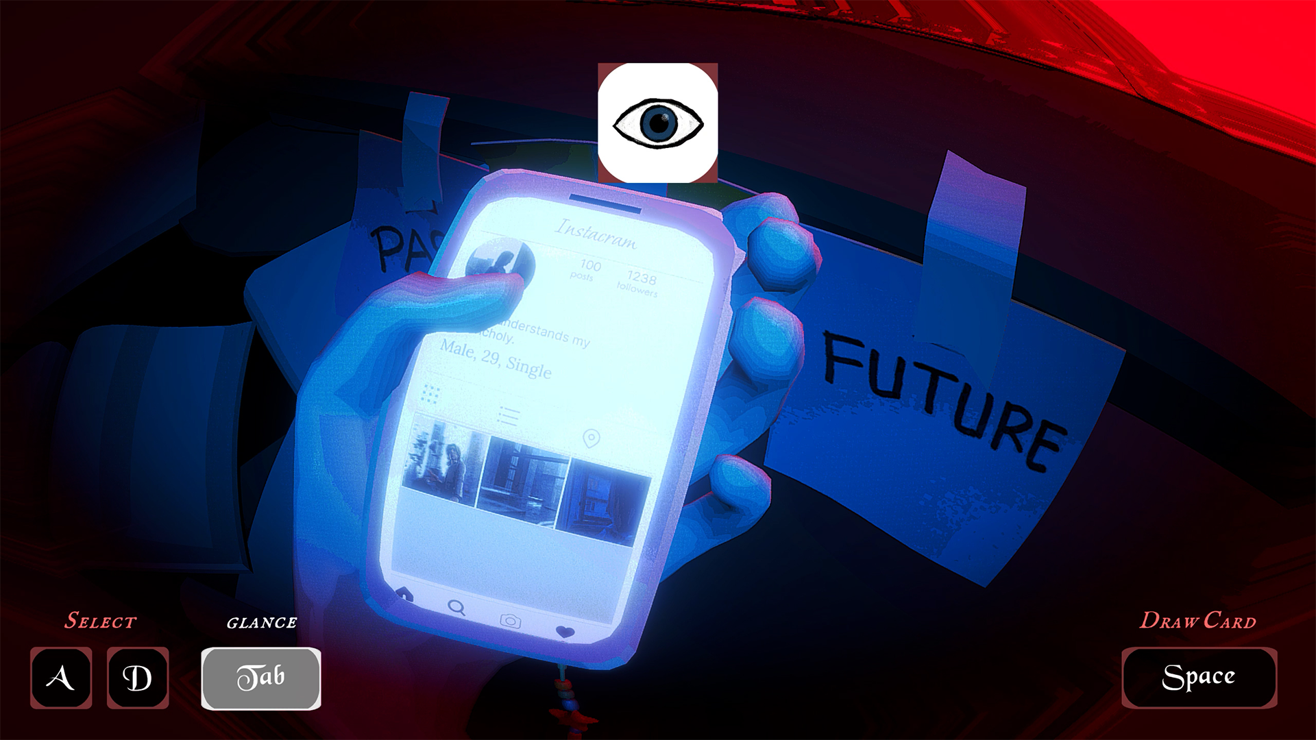 Acting Like I Know is a first-person dialogue game where you play a fortune teller who “reads the future” by secretly checking clients’ social media under the table, piecing together clues about their lives.